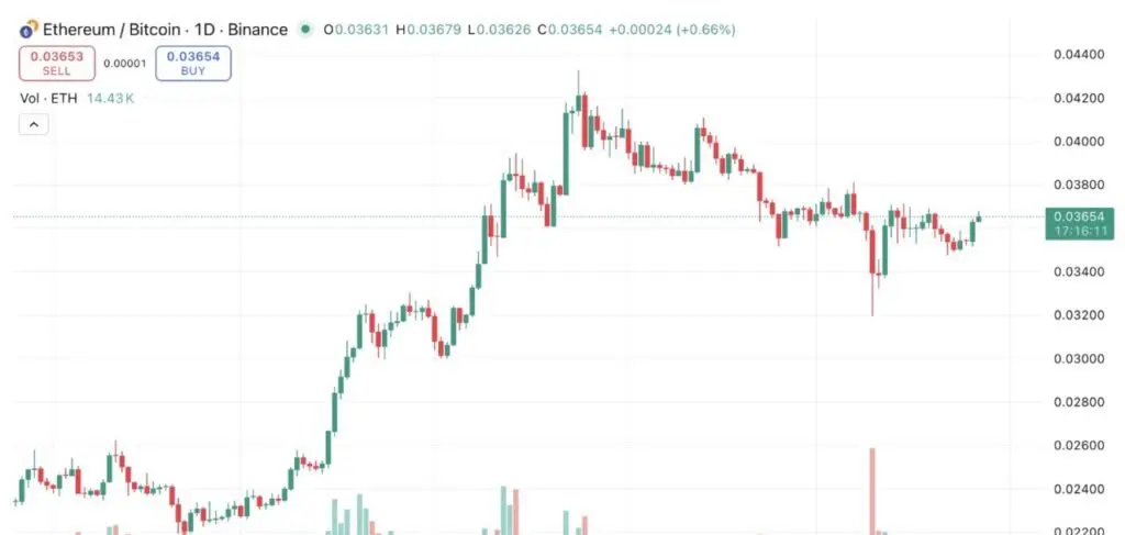 Otro análisis avanzado de un analista añade que la confirmación más fuerte de un posible auge de altcoins ocurriría si BTC.D cierra por debajo del 57% en el gráfico mensual, mientras que el par ETH/BTC rompe por encima del nivel de 0.041. Ambos estos umbrales sugieren que los inversores están comenzando a favorecer la tenencia de altcoins sobre Bitcoin, un patrón clásico que siempre precede a cada gran temporada de altcoins.