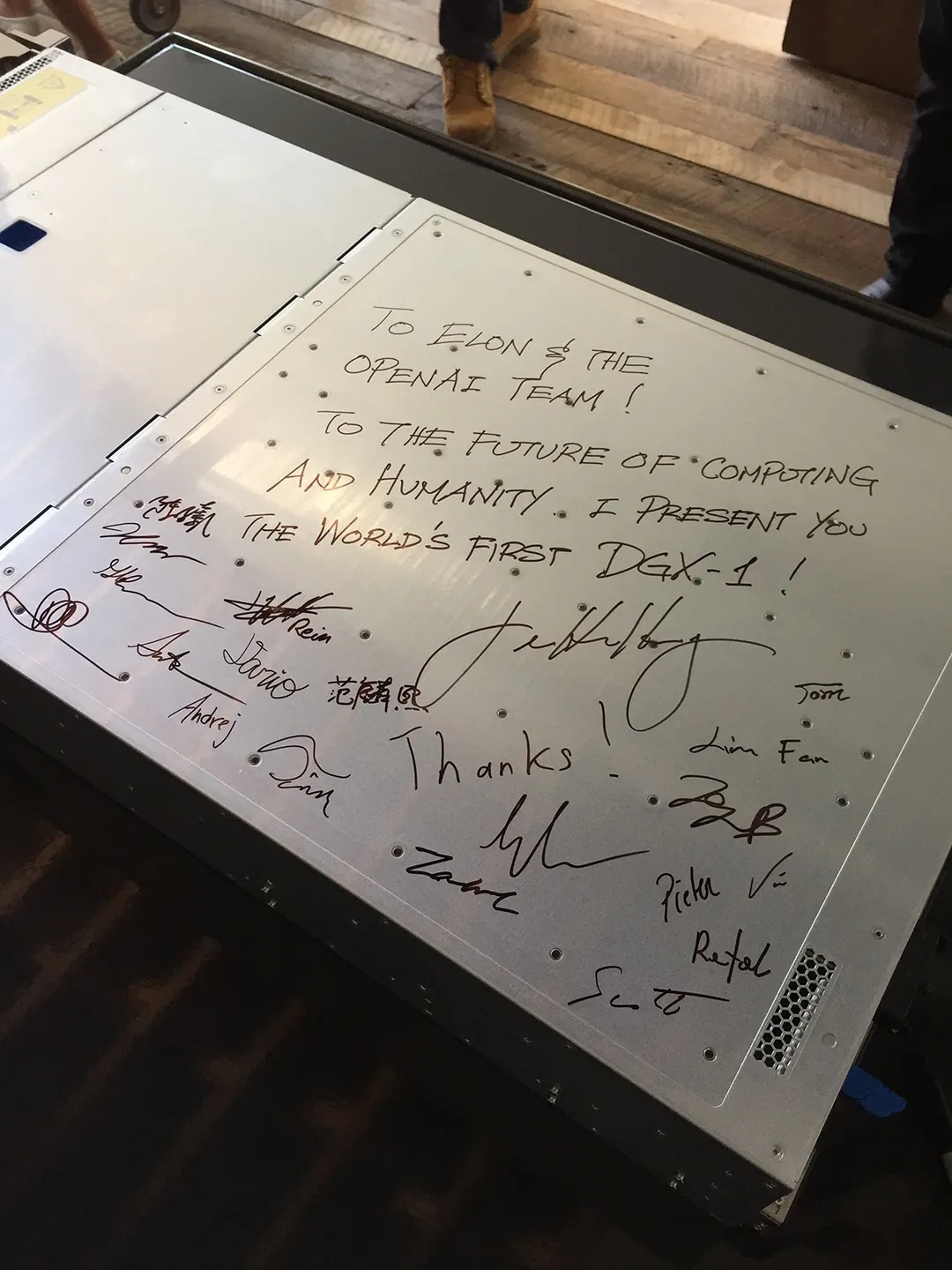 En agosto de 2016, nació un momento histórico cuando NVIDIA donó su primera supercomputadora de IA, la DGX-1, a la recién formada OpenAI. Jensen Huang entregó personalmente esta computadora a la oficina de OpenAI, donde el entonces presidente Elon Musk abrió el paquete con un cuchillo de caja.