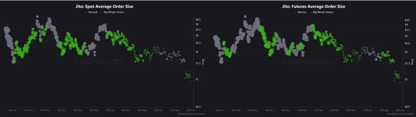 Les données sur la taille moyenne des ordres (Average Order Size) montrent que les grands investisseurs continuent d'accumuler JTO à la fois sur le marché au comptant et sur le marché des dérivés.