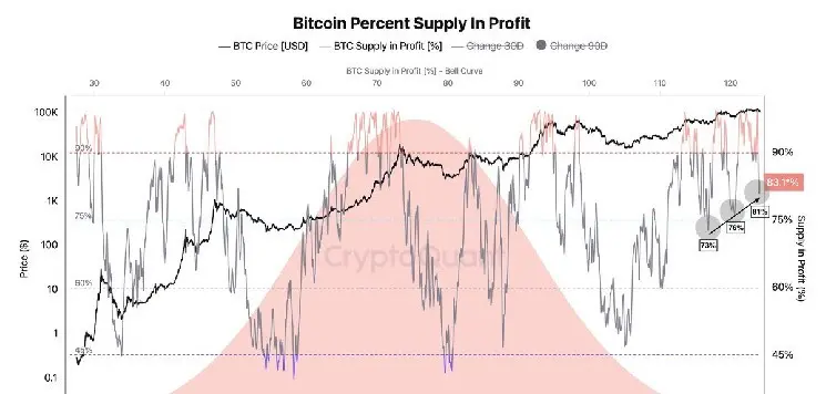 Cependant, l'analyste avertit qu'une fois que l'offre en profit dépasse 95 %, cela signale généralement des conditions de marché surchauffées — un point où l'euphorie tend à remplacer la conviction rationnelle. Dans de telles phases, le Bitcoin fait historiquement face à une volatilité accrue et à des corrections brutales alors que les traders surendettés et les spéculateurs à court terme prennent leurs bénéfices.