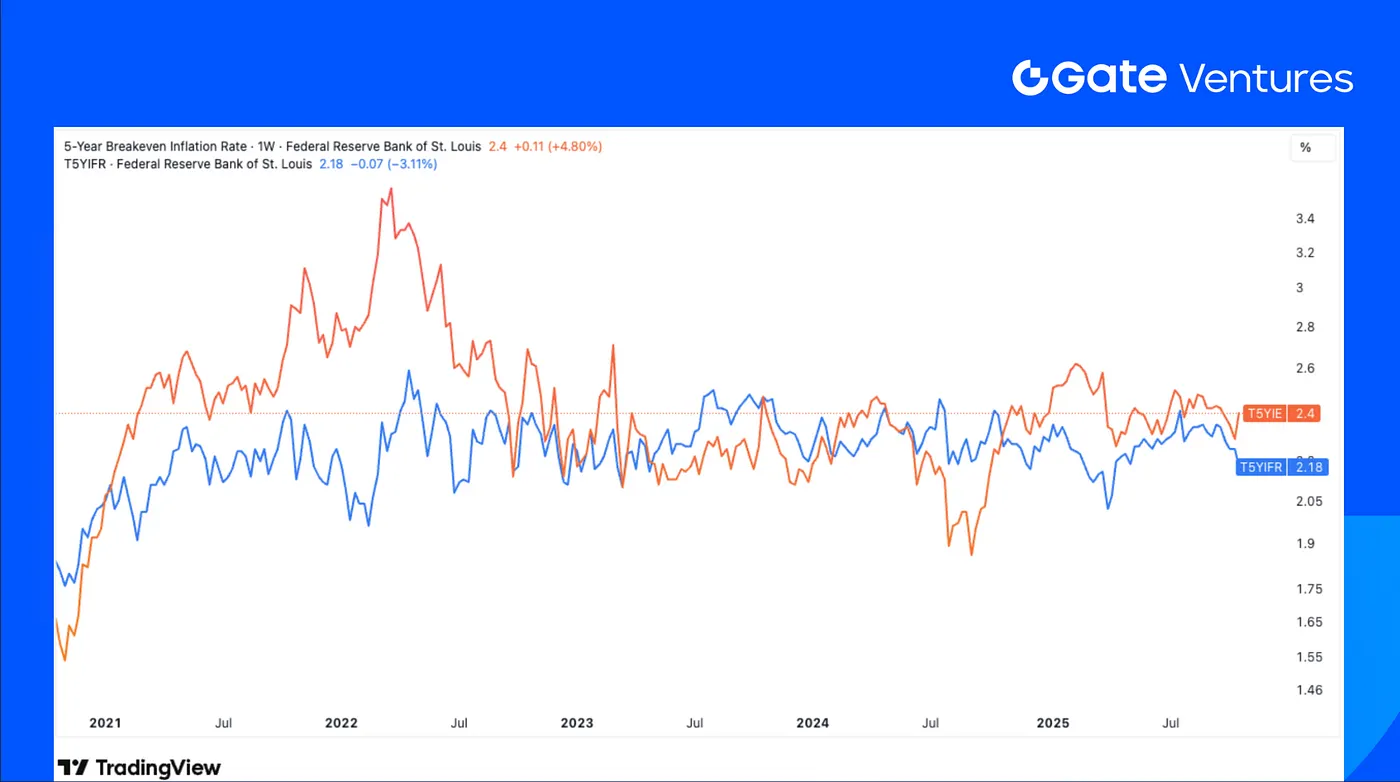 Dari perspektif dinamika harga aset, reli emas pada dasarnya mencerminkan suara ketidakpercayaan terhadap kredit masa depan dolar AS. Asumsi penetapan harga yang mendasari adalah bahwa pasar mengharapkan utang pemerintah AS yang tinggi pada akhirnya harus dilarutkan melalui beberapa tingkat inflasi. Sebaliknya, kinerja Obligasi AS dapat dilihat sebagai suara kepercayaan terhadap kredibilitas kebijakan: ekspektasi inflasi jangka panjang yang tersirat tetap stabil, menunjukkan bahwa pasar saat ini cenderung percaya bahwa Fed dapat mempertahankan target inflasinya di masa depan, atau bahwa potensi perlambatan ekonomi akan secara alami membatasi tekanan harga yang meningkat.