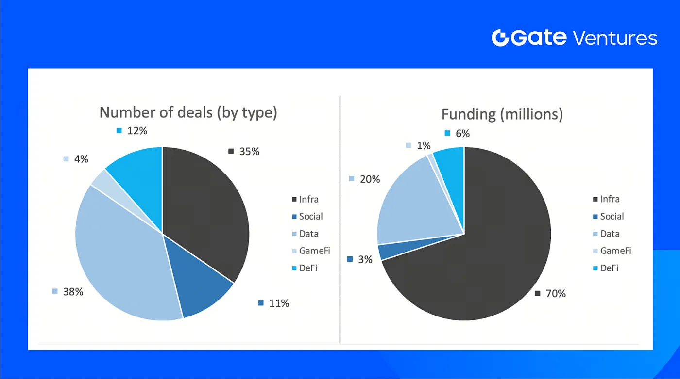 Jumlah transaksi yang ditutup dalam minggu sebelumnya adalah 26, dengan Data memiliki 10 transaksi, mewakili 38% untuk setiap sektor dari total jumlah transaksi. Sementara itu, Infra memiliki 9 (35%), Sosial memiliki 3 (12%), Gamefi memiliki 1 (4%) dan DeFi memiliki 3 (12%) transaksi.