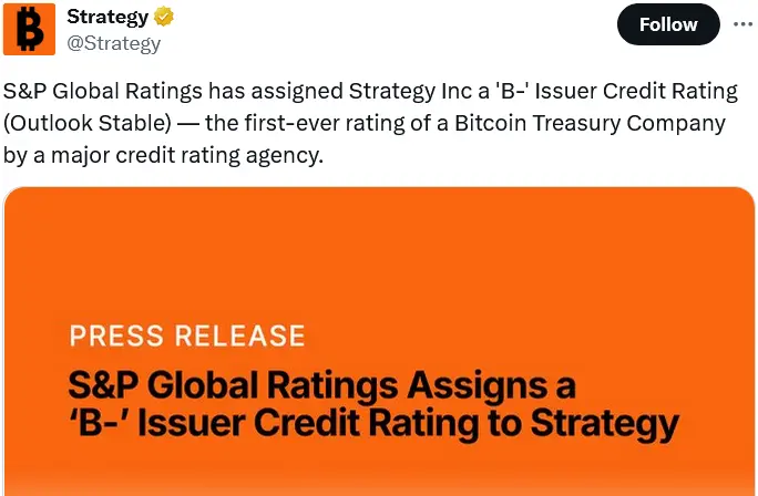 S&P Global Ratings telah memberikan strategi Michael Saylor peringkat kredit “B-”, menempatkannya di wilayah spekulatif, non-investasi — sering disebut sebagai “obligasi sampah” — meskipun mereka mengatakan prospek perusahaan perbendaharaan Bitcoin tersebut tetap stabil.