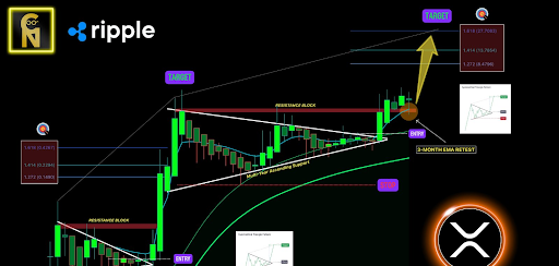アナリストのチャートによると、XRPは現在、数年間形成されてきた対称三角形のブレイクアウトパターンを完了しました。このブレイクアウトは、2017年にさかのぼる数年にわたる上昇サポートラインの上で発生しています。また、チャートには、2017年と2021年の以前のブルラン中にXRPの価格を抑えていた重要なレジスタンスブロックも示されています。