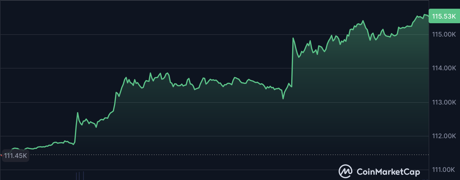 ビットコインが$115,000を超えて急騰し、過去24時間で3.5%の上昇を記録しました。これは、世界市場が新たなマクロ楽観主義と強い機関投資家の流入に支えられて上昇したためです。市場追跡プラットフォームのデータによると、ビットコインの時価総額は$2.3兆に達し、24時間の出来高は106%増加して$49 億を超えました。