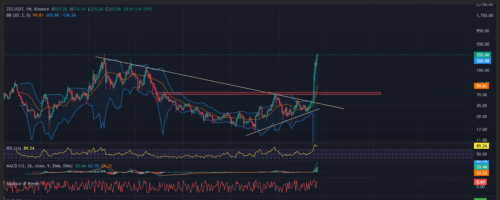 週足チャートでは、ZECが2021年以来価格を抑えてきた長期的な下降トレンドラインを明確に突破しました。$100–$120 の抵抗ゾーンを上抜けたことにより、大量の買い圧力が発生し、トークンは$355に向けて急上昇しました。