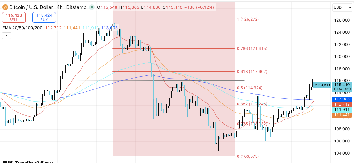 ビットコイン (BTC) は、$103,575 レベルから反発した後、再び強さを示しており、最近のセッションで安定した回復を示しています。この暗号通貨は主要な移動平均を取り戻し、現在は$115,900付近の200-EMA領域を試しています。これは、ブルが中期的なトレンドの反転を確認することを目指す重要な転換点を示しています。