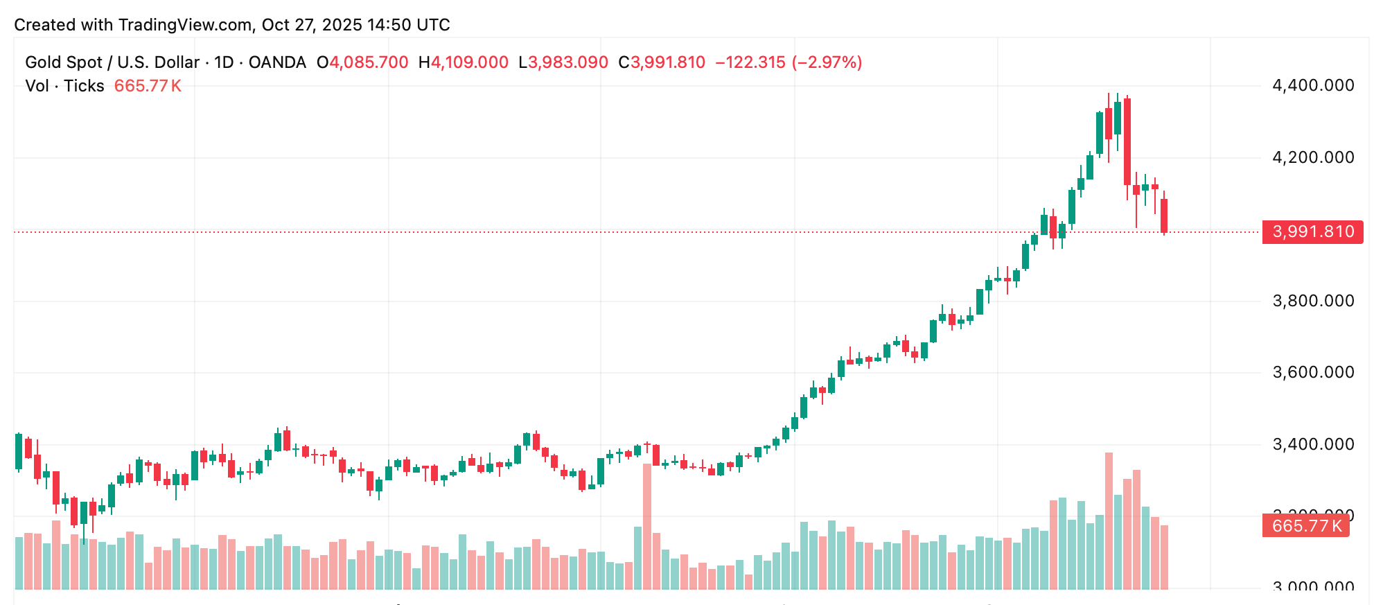 金が大きなラウンドナンバーを下回ったのは、米中貿易の話題が明るくなり、株式市場がより明るい顔を見せたためで、短期的に安全資産に対する需要が縮小しました。この動きは、市場のムードが少しバンカーから少しブランチに変わったことを反映しています。10月27日の東部標準時午前11時の時点で、金の価格はトロイオンスあたり$3,991です。