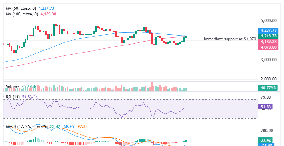 50日および100日移動平均線を上回る価格動向は、短期的なポジティブなトレンドを確認しており、トレーダーは$4,100と$4,250の間の流動性クラスターを注意深く監視しています。