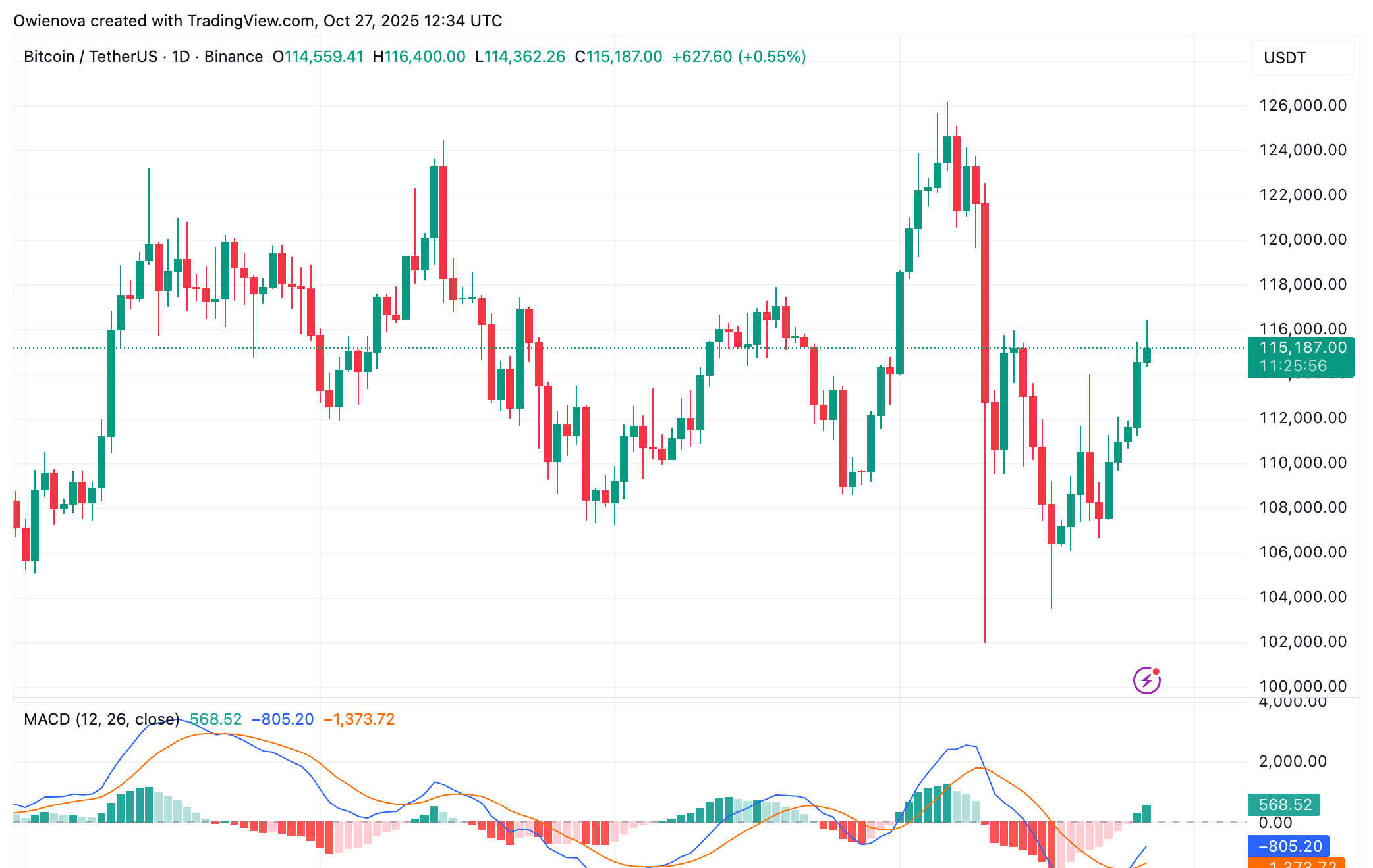 最近のBTC 1H 現在のチャート更新では、ビットコインの時間足チャートが現時点でほとんど強気の反映を示していないことが強調されました。市場のセンチメントは弱まっており、特に$116,000の流動性ゾーンがクリアされた後、より広範な暗号市場全体の見通しがさらに悪化しました。