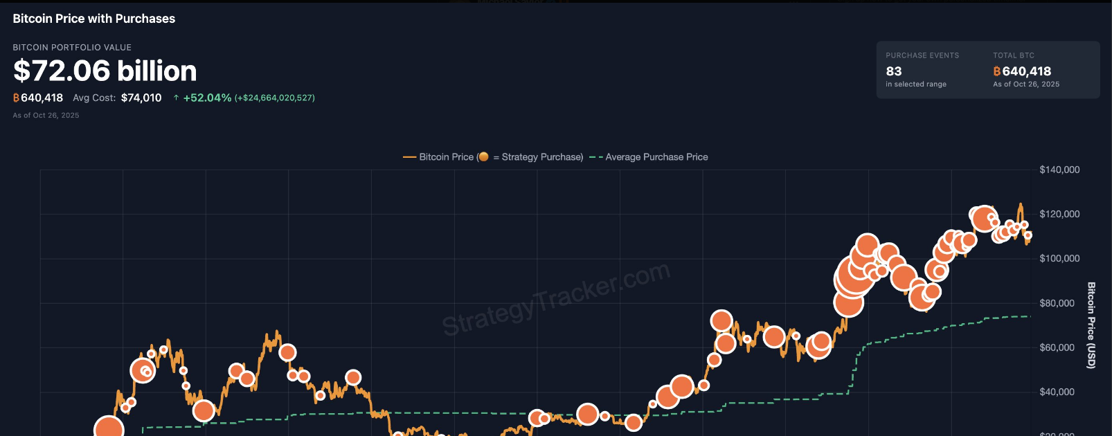ビットコインは日曜日に上昇し、米中貿易緊張の緩和の兆しがリスク資産を押し上げ、ある会社の創設者がその会社がビットコインの保有を増やし続けていることを示唆しました。会社は購入を続けています--------------------会社の創設者は、最近の購入を示すためにオレンジのドットを使用したチャートを10月26日に投稿しました。この視覚的な合図は、新しい購入の略語として彼のものになっています。報告によると、会社は10月13日から10月20日の間に387 BTCを追加し、合計640,418 BTCとなりました。その数字はそれ自体で印象的です。価格が変動しているときでも、購入に対して安定した意図的なアプローチを示しています。その会社が開示したビットコインの平均取得コストは74,010ドルです。同社の最近の動きは、9月に数回の大規模な取引で7,000BTC以上を取得した時に比べて小規模です。今週の新たな購入の規模は公表されていません。同時に、ビットコインの市場の動きは、より広範なニュースの影響を受けていました。ビットコインの価格は日曜日に約1.6%上昇し、イーサリアムはおおよそ2.8%の上昇を記録しました。短期的な変動は、特定の企業の行動よりも見出しによって引き起こされているようです。保有、評価、実績------------------------------------報告によると、BTCの価格が11万5000ドルを少し超えると、同社のビットコインの保有額は約$72 億ドルと評価されています。その評価は、2020年にプログラムが始まって以来、約474億ドルの総コスト基準に対して、$25 億ドル以上のペーパーゲインを示唆しています。その期間中に83件の別々の購入イベントが記録されており、このパターンは投資家に企業の戦略を明確に示しています:繰り返し購入し、その後報告することです。購入の一部は9月に集中しており、その際に企業は数回の大きな動きで何千ものコインを追加しました。しかし最近では、配分は小さく、より頻繁に見えるようになっています。その変化は、一度の大きな賭けよりも安定した蓄積を好む傾向を示唆しています。 ###購買行動と市場の反応その会社の株式は、会社の純資産価値を上回って取引されています。この事実は、投資家がトークンを直接購入することなくビットコインへのエクスポージャーを得る手段として株式を保有することに満足していることを示唆しています。会社の方法は --- 事後に購入を発表し、市場に保有を反映させる --- 一貫しており、予測可能です。### 地政学的ヘッドラインがボラティリティを駆動一方、米国と中国の当局者は貿易交渉の進展を示し、それが一部の投資家を落ち着かせるのに役立ちました。報告によると、スコット・ベセント氏はCBSニュースに対し、100%の関税と即時の輸出管理体制の脅威が和らいだと予想していると述べました。10月初め、中国はチップ製造に使用される希少金属の輸出に対する厳しい制限を発表しました。10月11日、アメリカのドナルド・トランプ大統領は、中国製品に追加の100%の関税を課し、11月1日に発効予定の特定のソフトウェアに対する輸出管理を計画していると述べました。その鋭いレトリックの日々は、市場全体に大きな損失を引き起こし、今年の暗号市場で最大の清算イベントの1つを引き起こしました。