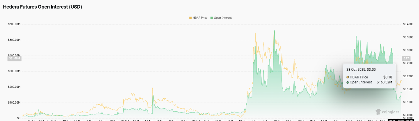 スポット価格の動きだけでなく、Hederaのデリバティブデータはトレーダーのセンチメントの変化を反映しています。オープンインタレストは、2025年の初めにHBARが$0.35に近づいたときに$500 百万を超えたピークに達しましたが、その後$163.52百万に減少しました。この減少は、投機的なレバレッジの低下と、よりオーガニックでスポット主導の市場回復を示唆しています。レバレッジの冷却は、需要が引き続き上昇する場合、持続的な成長のためのより健康的な基盤を提供するかもしれません。