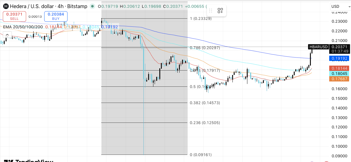 さらに、4時間チャートはHBARが以前は強い抵抗として機能していた$0.20のレベルを取り戻したことを強調しています。このゾーンでのクローズを維持できれば、価格は$0.23や$0.25に向かう可能性があります。逆に、$0.19のサポートを維持できない場合、短期的な修正が$0.18や$0.16に向かう可能性があります。