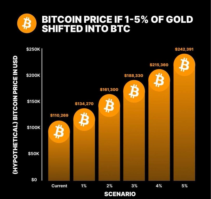 もしビットコインが金の市場価値のほんの小さなシェアを獲得した場合、価格は急激に上昇する可能性があります。1%の回転でビットコインは約134,000ドル、3%のシフトで約188,000ドル、5%のシフトで約242,000ドルの価値がつくでしょう。
