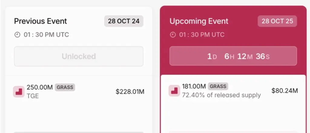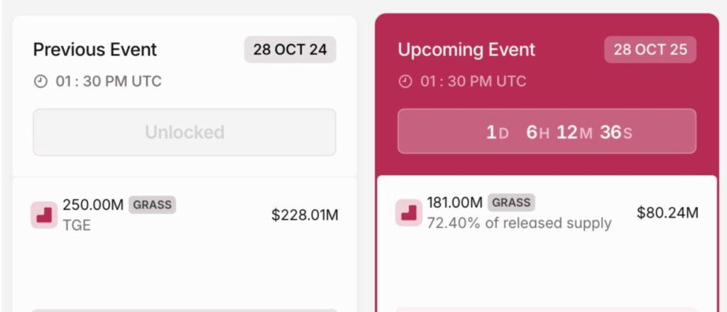 10月28日に、プロジェクトは1億8100万GRASSトークンをリリースします。これらのリリースされたトークンの総価値は約8024万ドルと推定されており、これはリリースされた総トークンの72.4%を占めます。これは2024年10月のトークン生成イベント(TGE)以来の初めての大規模トークンリリースです。