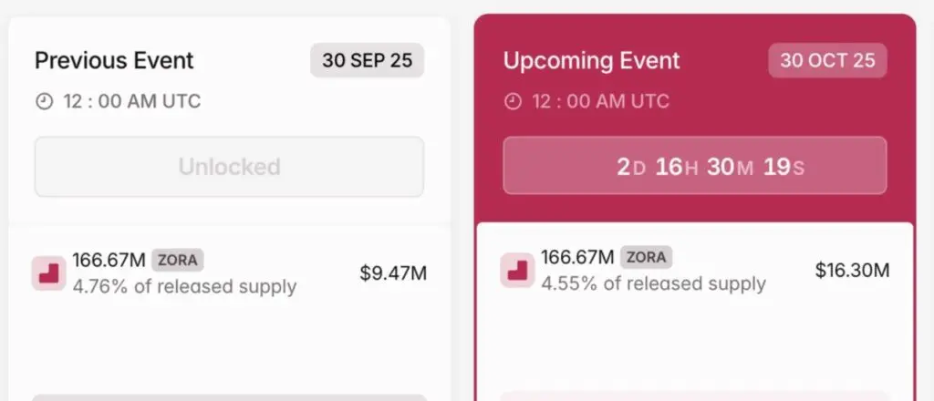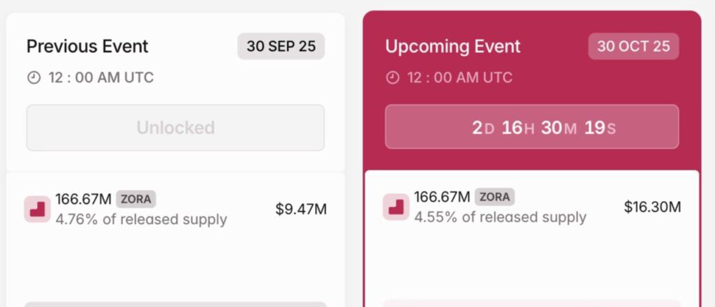 10月30日に、ゾラは約1630万ドル相当の1億6667万トークンを解除します。この金額は発行済み供給の4.55%を表しており、主要な利害関係者向けに意図されています。