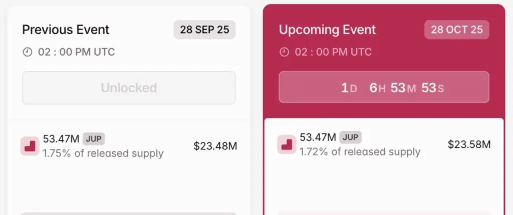 10月28日に、ジュピターは約2358万ドル相当の5347万JUPトークンを解除します。この金額は、発行済み供給量の1.72%に相当します。このプロセスは、クリフシステムを伴う月次ベスティングスケジュールに従います。