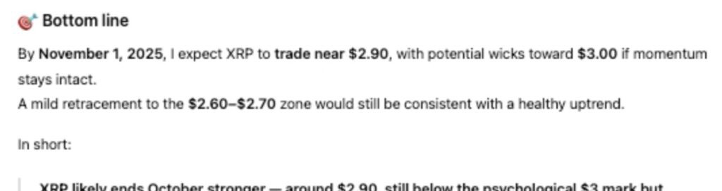 AIモデルはまた、XRPが市場の勢いが強いときに8%から10%の急激な動きをする傾向があることに注意しました。一般的な暗号市場のセンチメントがポジティブであるため、XRPはさらに上昇し、11月に入る前に$3 レベルをテストする可能性があります。