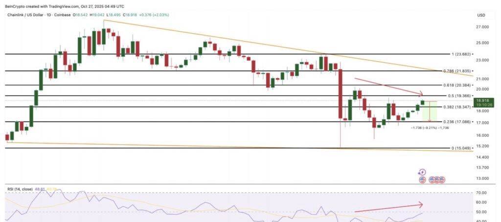 FOMC会議を前に注目すべき最初のアルトコインはChainlink (LINK)で、そのチャートは慎重さと可能性の両方を反映しています。LINKは現在、下落ウェッジパターンにあり、通常は強気の反転を示すものですが、10月13日から27日の間には隠れた弱気のダイバージェンスもありました。