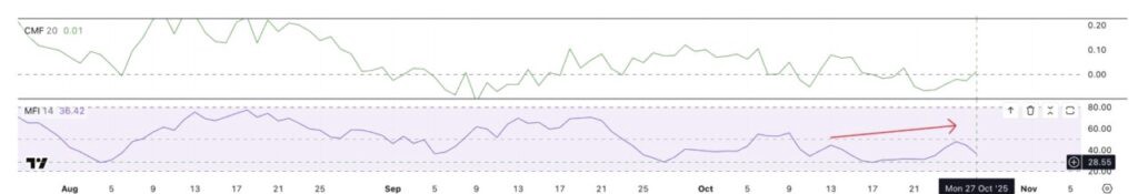 しかし、すべてのシグナルが弱気というわけではありません。資産からの資金の流入と流出を測定するマネーフローレシオ(MFI)は、10月中旬以降に高いピークを示しており、下落の過程での買いがまだ続いていることを示しています。一方、大口投資家(クジラ)による蓄積の指標であるチャイキンマネーフロー(CMF)は、ゼロを上回り、大口ホルダーが再びLINKを買い始めていることを示しています。