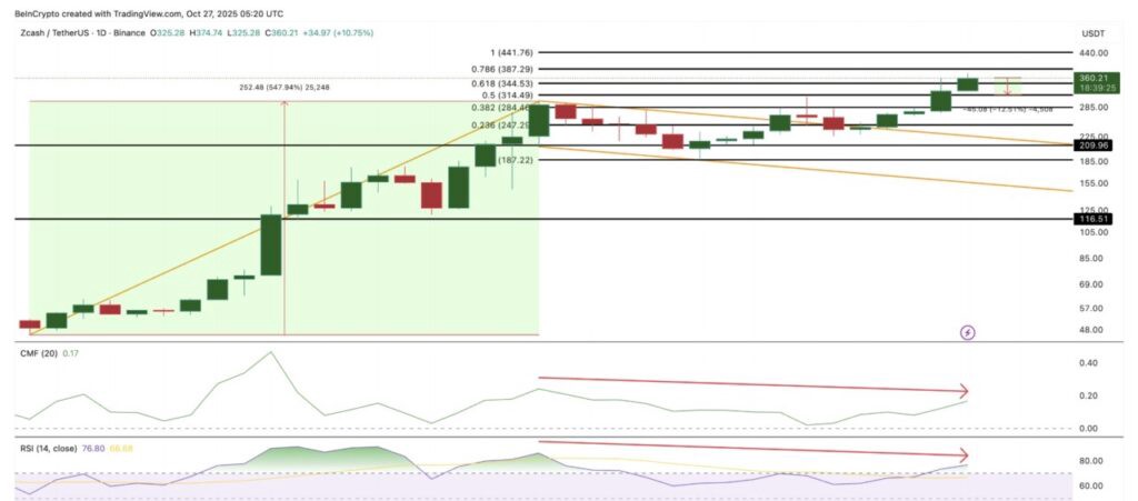 10月11日から27日までの間、相対力指数(RSI)およびチャイキンマネーフロー(CMF)インジケーターは日足チャートで弱気のダイバージェンスを示しました。価格は高値を更新しましたが、RSIとCMFは低い高値を形成しました。これは、価格が上昇し続けているにもかかわらず、買いの力が弱まっていることを示しています。これは、約10%-12%の軽い修正の機会を開きます。言い換えれば、ZECの価格は$314 レベルまたはそれ以下の$284 を再テストする可能性があり、その後上昇トレンドを再開することができます。$247 周辺のゾーンは、より深いサポートエリアとなり、$187 を下回ると現在形成されている強気の構造が無効になる可能性があります。