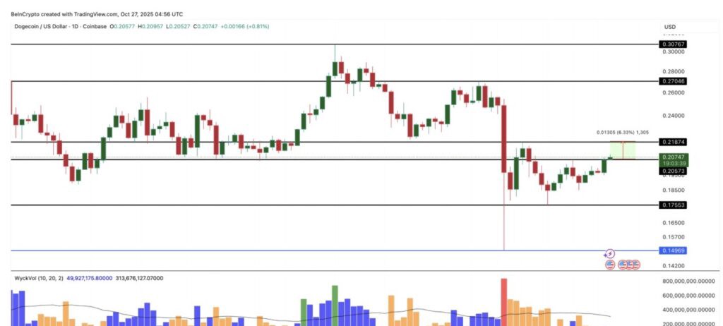 FOMC会議を前に注目すべき2つ目のアルトコインは、現在潜在的なブレイクアウトの瀬戸際にあるDogecoin (DOGE)です。Dogecoinの価格は10月11日以来横ばいで推移しており、$0.17と$0.20の間で変動しています。トレーダーは次の動きのきっかけを待っています。