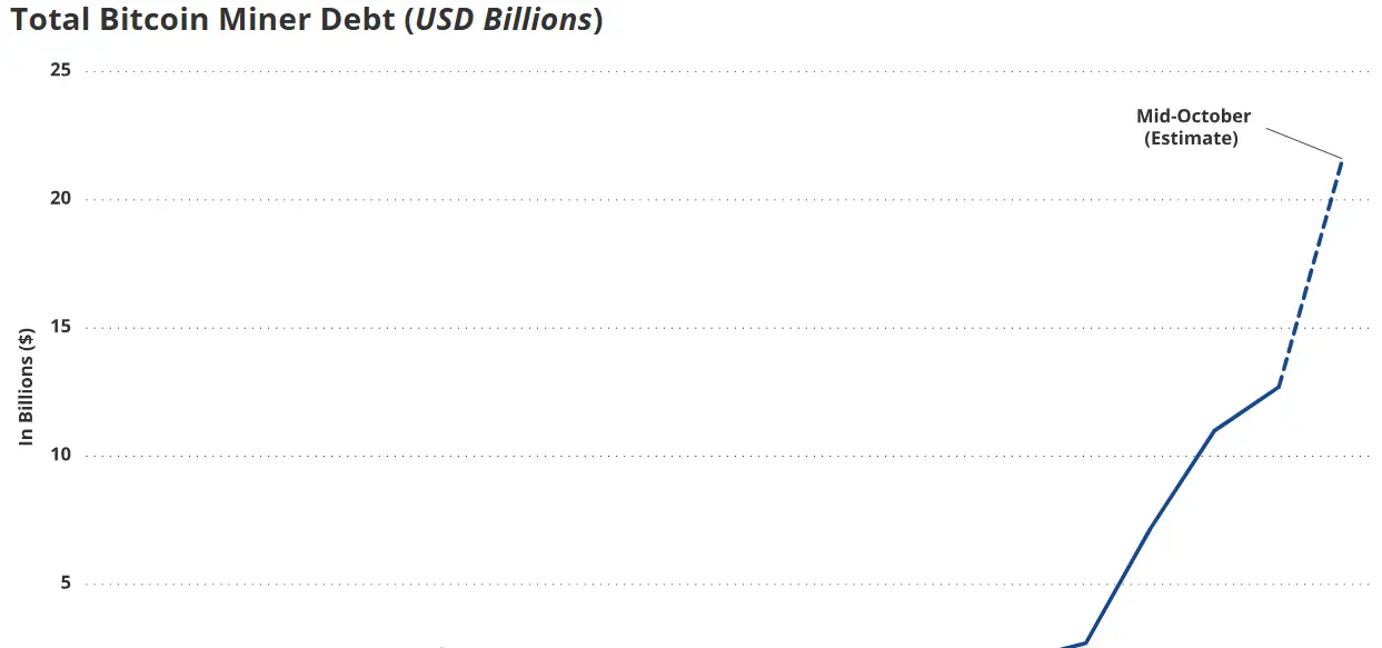 A dívida total no setor disparou para 12,7 bilhões de dólares, em comparação com 2,1 bilhões de dólares há apenas 12 meses, segundo pesquisas. Os pesquisadores observaram que os mineradores devem investir continuamente em hardware de próxima geração para manter sua participação na taxa de hash total do Bitcoin e evitar ficar para trás em relação aos concorrentes.