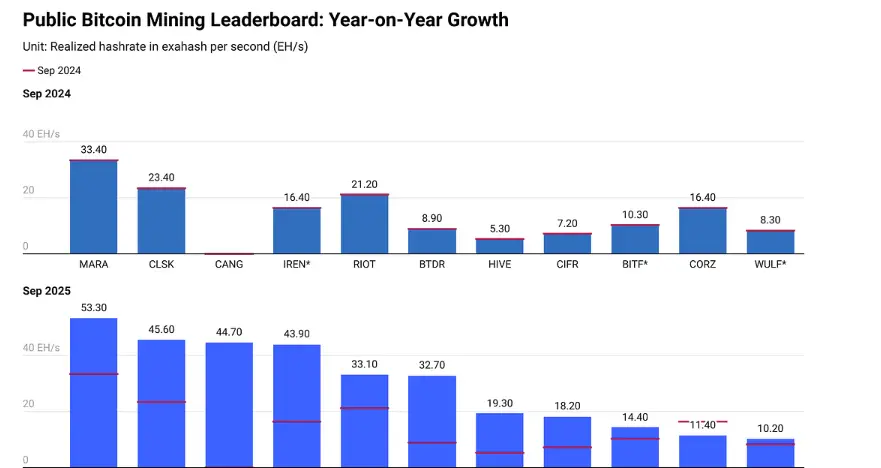 Enquanto a MARA, CleanSpark e Cango mantiveram as suas posições como os três maiores mineradores públicos, rivais como IREN, Cipher, Bitdeer e HIVE Digital registaram aumentos significativos ano após ano na hashrate realizada.