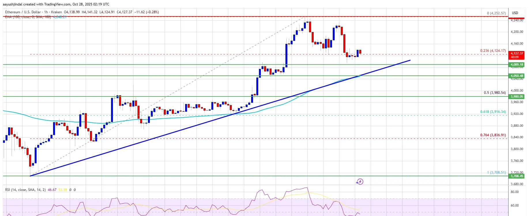 O preço do Ethereum começou um aumento decente acima de $4,000. O ETH está consolidando ganhos e pode visar mais ganhos acima da resistência de $4,220.