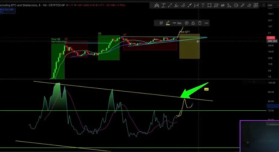 Olhando além da semana imediata, Gambardello, que acredita que o mercado ainda está nas fases iniciais de uma fase de touro eufórica, compartilhou insights sobre como identificar o eventual pico do ciclo. Ele enfatizou dois indicadores macroeconômicos chave: