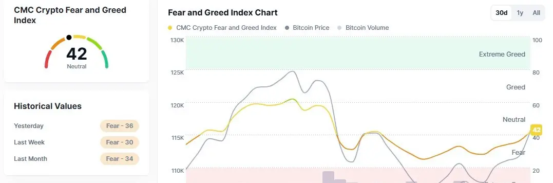 O BTC registou cinco ganhos diários consecutivos, negociando perto de $115,679 durante a sessão matinal de Londres na segunda-feira, elevando a capitalização total do mercado de criptomoedas em 3,7% para cerca de $3,9 trilhões. Esta recuperação diminuiu significativamente os medos de uma correção adicional, refletidos em um aumento do Índice de Medo e Ganância da CoinMarketCap.
