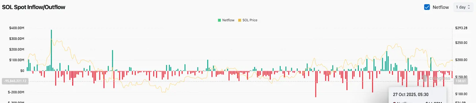 Os fluxos líquidos à vista da Solana registaram $66,98 milhões em saídas no dia 27 de outubro, sinalizando que alguns traders estão a realizar lucros após o recente aumento. Isto marca uma das maiores saídas líquidas em um único dia nas últimas semanas, consistente com a pausa observada em torno do $200 .