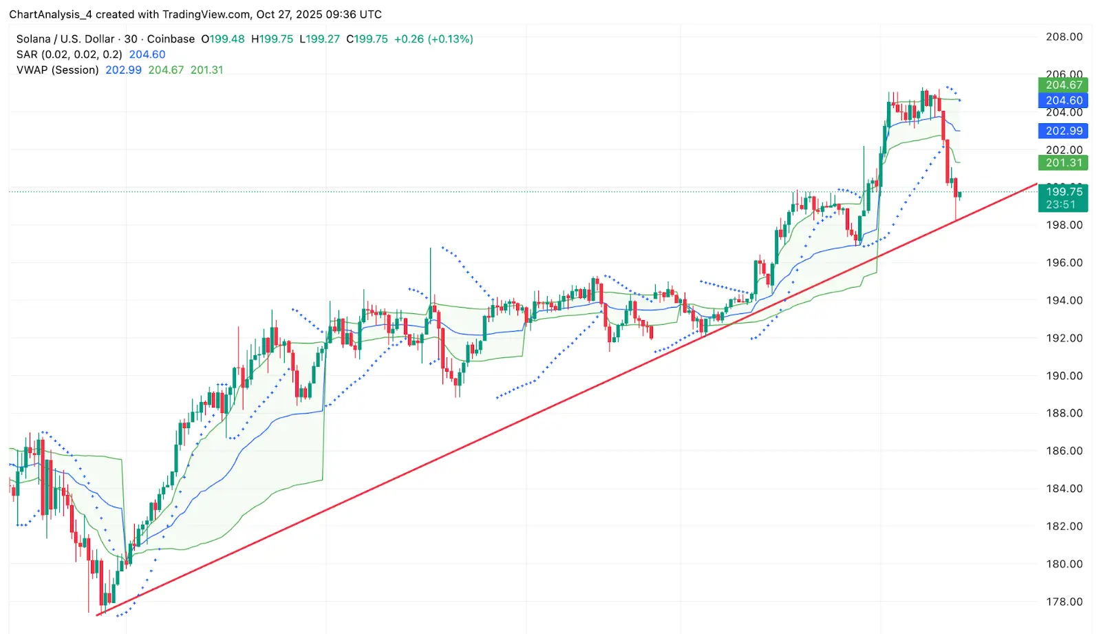 No gráfico de 30 minutos, o preço do SOL continua a ser suportado por uma linha de tendência ascendente que se estende da região $185 . Os pontos do Parabolic SAR continuam a acompanhar ligeiramente acima do preço atual, mostrando uma fase de correção a curto prazo.