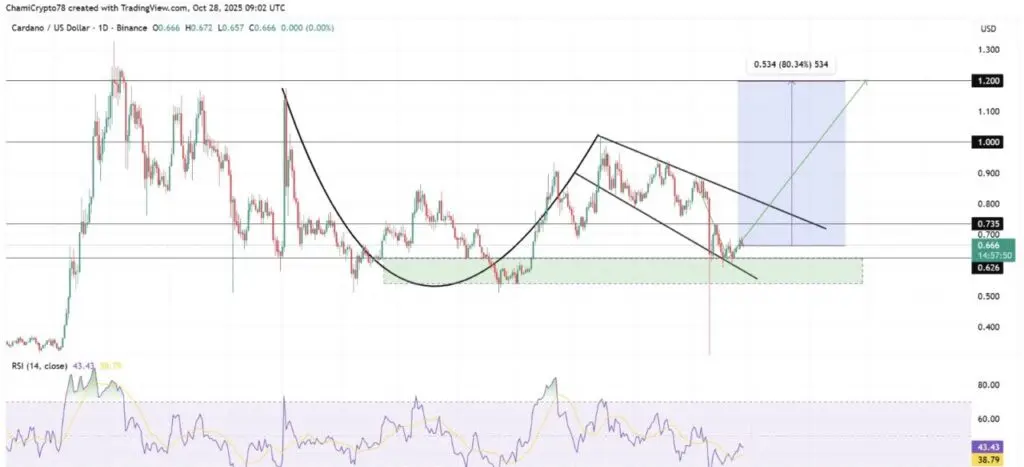 На 28 октября цена ADA консолидируется около $0.66 после отскока от сильной зоны спроса в диапазоне от $0.62 до $0.63. На дневном графике (10/28) наблюдается четкий паттерн чашка с ручкой, который развился в паттерн нисходящий клин, что часто является знаком значительного отскока.