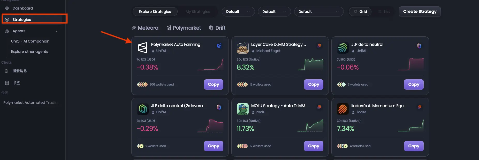 UnifAI — это платформа, которая позволяет независимым AI-агентам выполнять задачи как в цепочке, так и вне ее в экосистеме Web3. Платформа запустила несколько независимых AI-стратегий-агентов, и пользователи могут бесплатно запустить необходимые стратегии, просто нажав на кнопку копирования. Агент стратегии Polymarket на завершающем этапе — одна из недавно запущенных стратегий, согласно данным платформы, уже 206 кошельков используют эту стратегию.