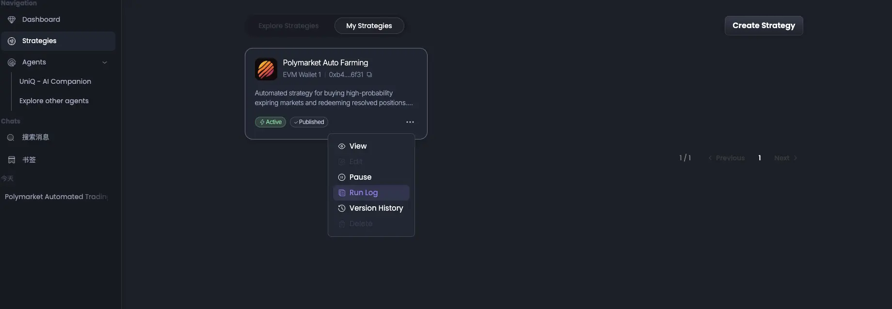 На странице “Strategies” нажмите на “My Strategies”, чтобы увидеть текущие работающие стратегии. Пользователи также могут выбрать остановить эту стратегию или нажать “Run Log”, чтобы просмотреть журнал выполнения стратегии.