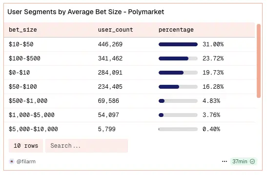 Это означает, что у пользователей осталось максимум 3-4 месяца для взаимодействия с Polymarket. Хотя ходят слухи, что Polymarket уже провел несколько раундов снимков, даже если начать взаимодействие сейчас, это не слишком поздно. Согласно данным Dune, более 90% пользователей ставят суммы ниже 100 долларов, а китов, ставящих от 5000 до 10000 долларов, всего 0,4%. Таким образом, хотя у Polymarket кажется, что количество пользователей велико, стратегии и руководства по использованию Polymarket уже “разлетаются повсюду”, на самом деле количество людей, которые действительно прилагают усилия, может быть не так уж и много; ставя более 500 долларов, вы легко можете попасть в топ 10%.