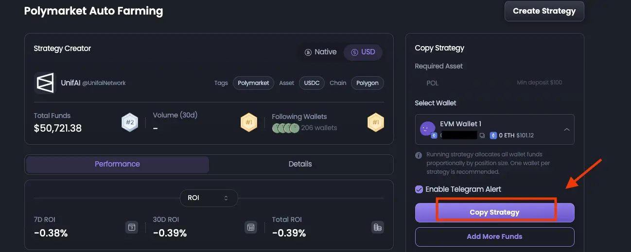 Работа с этой стратегией очень проста: сначала войдите на сайт UnifAI с помощью своей учетной записи Telegram, затем нажмите на «Стратегии», а затем перейдите к «Polymarket Auto Farming».
