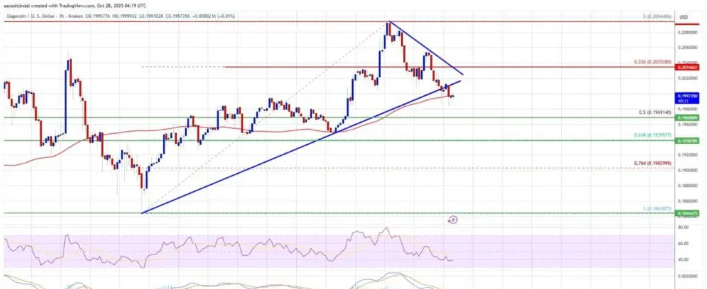 После успешного выхода выше $0.1920, Dogecoin (DOGE) начал новое восхождение, аналогичное Bitcoin (BTC) и Ethereum (ETH). DOGE удалось пробить уровень сопротивления в $0.20 и войти в положительную зону. Однако после достижения пика на уровне $0.2094, DOGE начал корректировать свои прибыли. Он упал ниже уровня коррекции Фибоначчи 23.6% восходящего движения от минимума $0.1843 до максимума $0.2094.