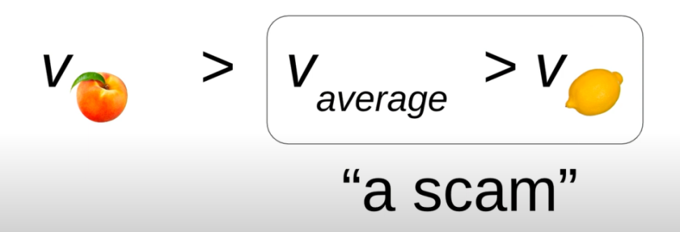 Yani, bir araba satın aldığınızda veya bir protokol kullandığınızda, bu ‘şeftali’ olma olasılığı belirli bir olasılığa sahiptir, aynı şekilde ‘limon’ olma olasılığı da vardır. Bu nedenle, bunun için ödemeyi düşündüğünüz miktar nedir? ‘Şeftali’ veya ‘limon’ olma olasılığına dayalı olarak ödemeyi düşündüğünüz ağırlıklı ortalamalı fiyat ne kadardır?