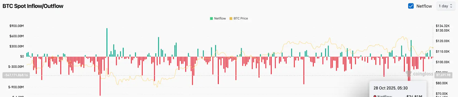 Verilere göre, 28 Ekim'de spot borsa net akışları yaklaşık --$24.8 milyondu ve bu, borsalardan hafif BTC çıkışlarını gösteriyor. Büyük olmasa da, bu değişim, sahiplerin koinleri yavaş yavaş depolamaya taşıdığını, geçen haftaki panik düşüşünden sonra iyileşen bir güven işareti olduğunu öne sürüyor.