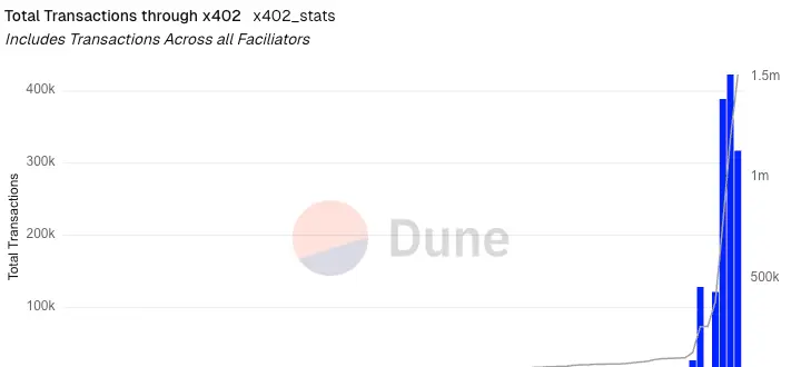 Tổng số giao dịch x402 cũng đang bùng nổ, với tổng số tích lũy tăng vọt lên 1,51 triệu hôm nay từ chỉ 60.000 vào đầu tháng Mười, theo dữ liệu từ các nền tảng phân tích.